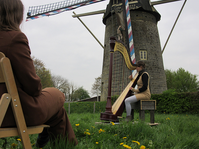 In ‘De stem van de molen’ spelen een bewegende klankinstallatie, harpmuziek, een vertelling en een draaiende molen de hoofdrol. Terwijl Iris vertelt over de relatie die de molenaar heeft met zijn molen, beantwoordt de harp de klank die van de molen komt. Doordat klankbronnen zijn bevestigd aan de wieken, klinkt het geheel bij iedere windsterkte anders. Soms fluistert de molen, soms zingt hij. Centraal staat de wind die alles beroert en in verwarring brengt. Het publiek zit buiten, aan de voet van de molen. Het kijkt naar de ontketende wieken en hoort hoe de molen een stem krijgt.